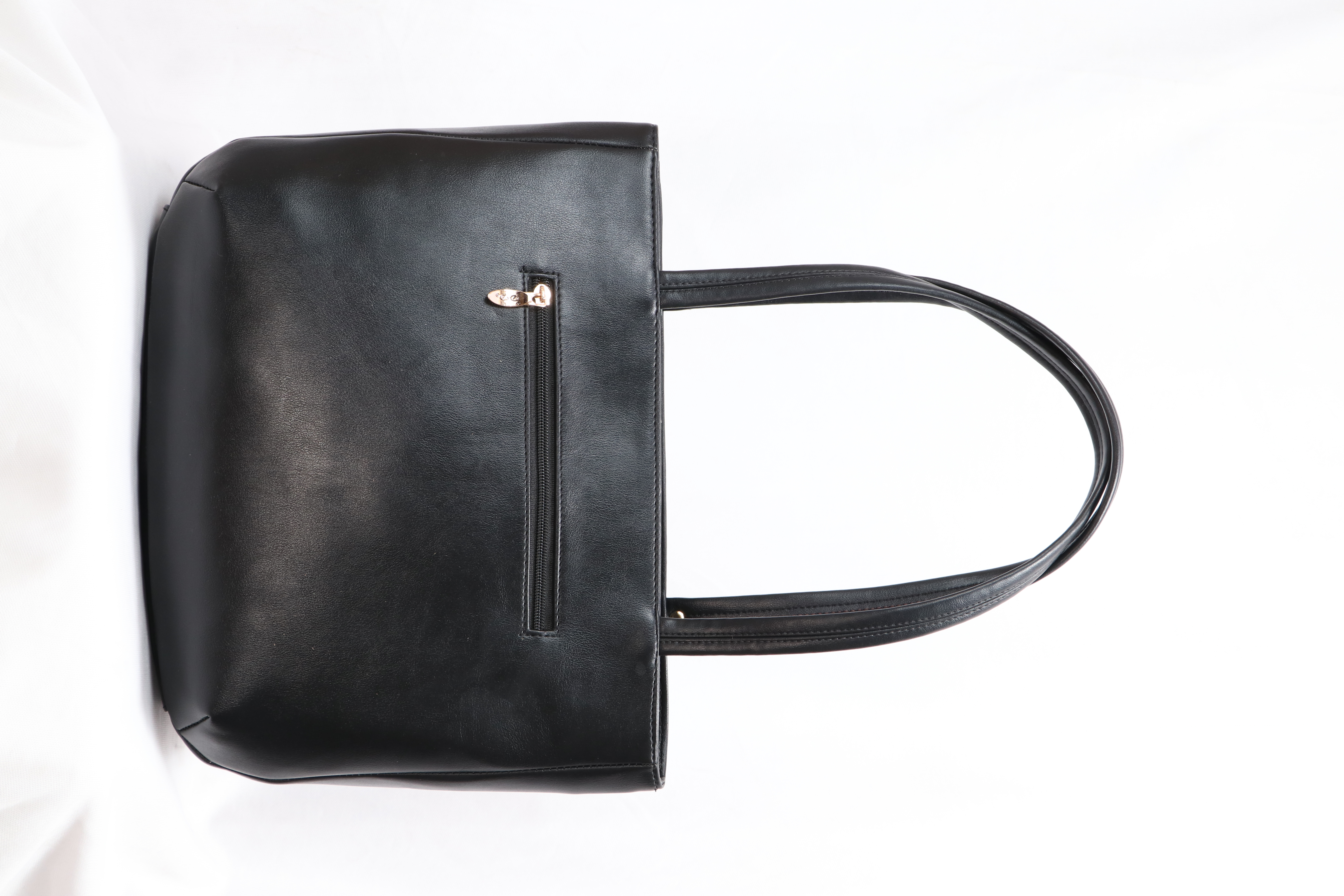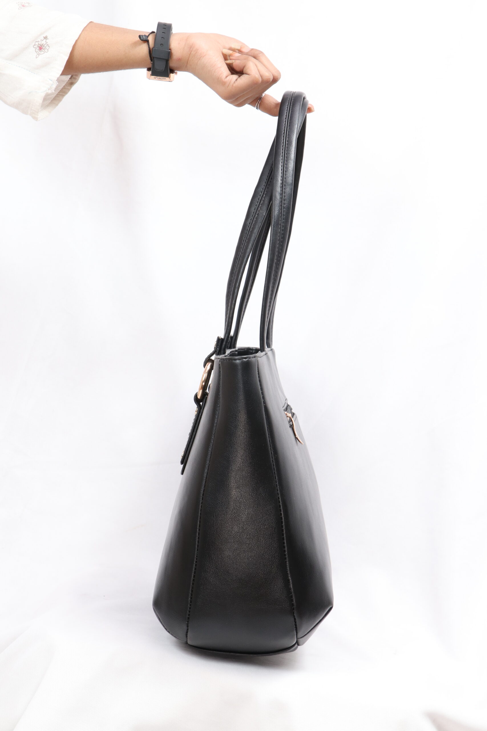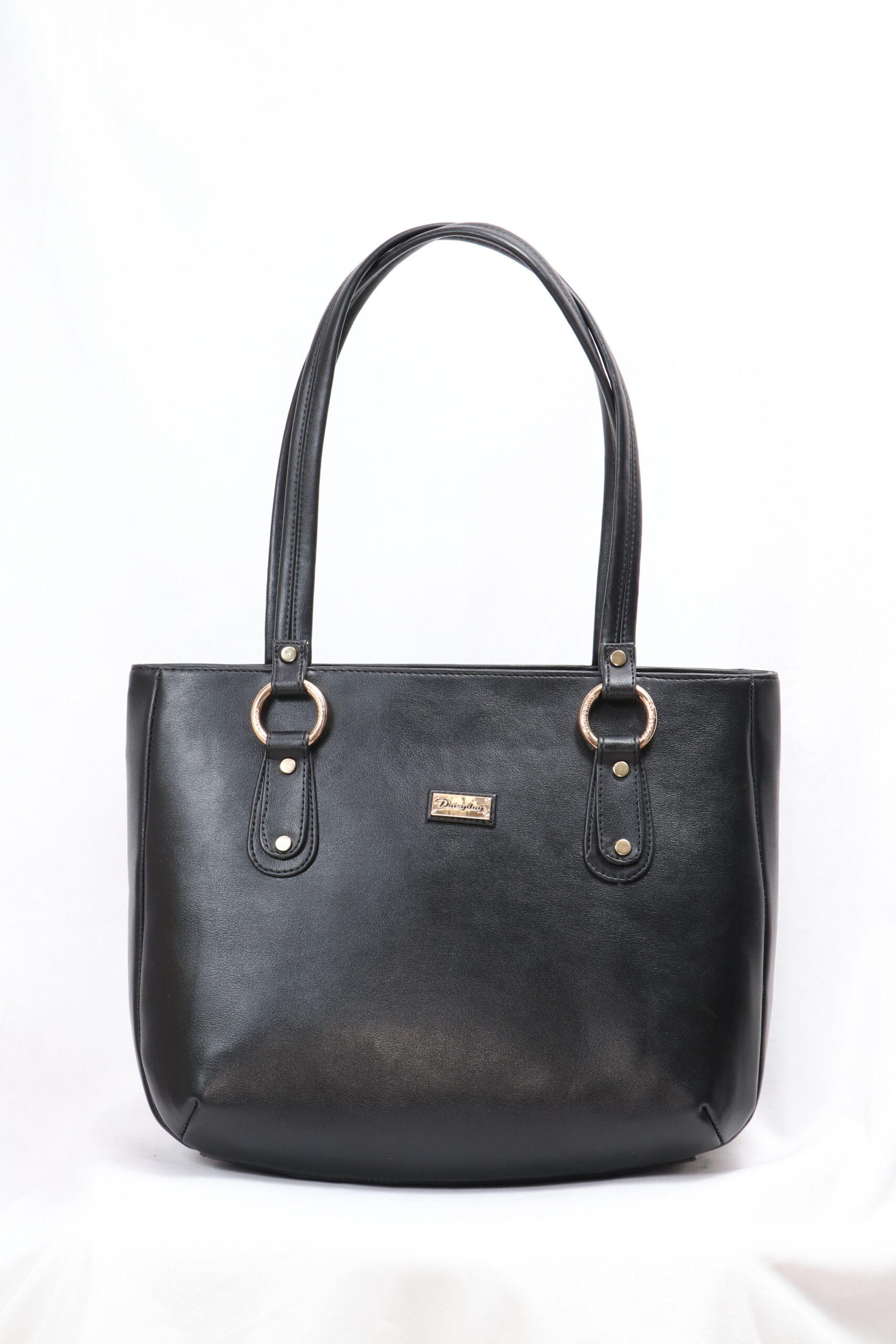 this sleek black tote bag offers a perfect balance of sophistication and functionality. Crafted from smooth, durable leather, it features a spacious interior ideal for daily essentials. The long shoulder straps with gold-tone ring accents add a stylish touch, while the minimalist design makes it a versatile companion for work, shopping, or everyday use.