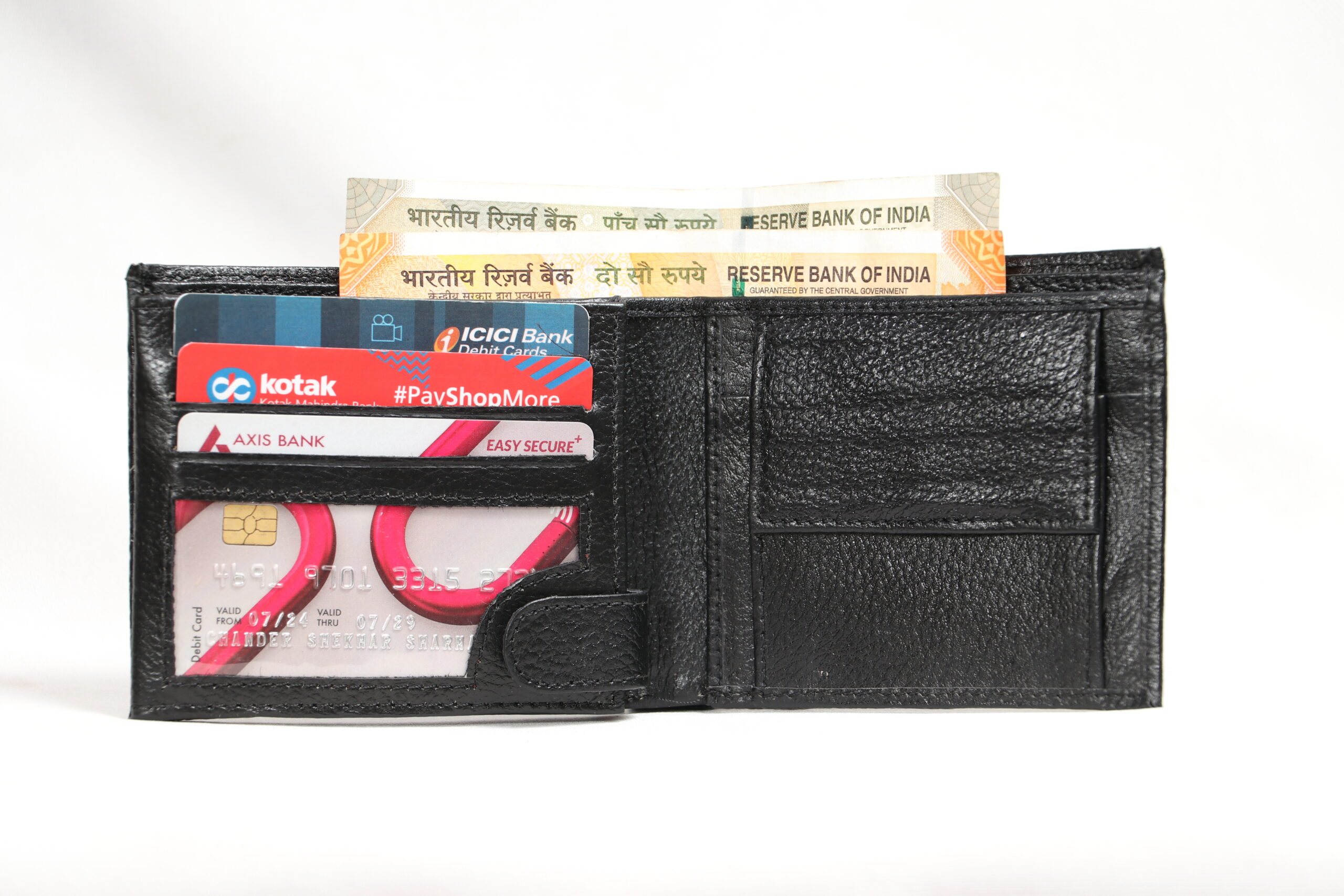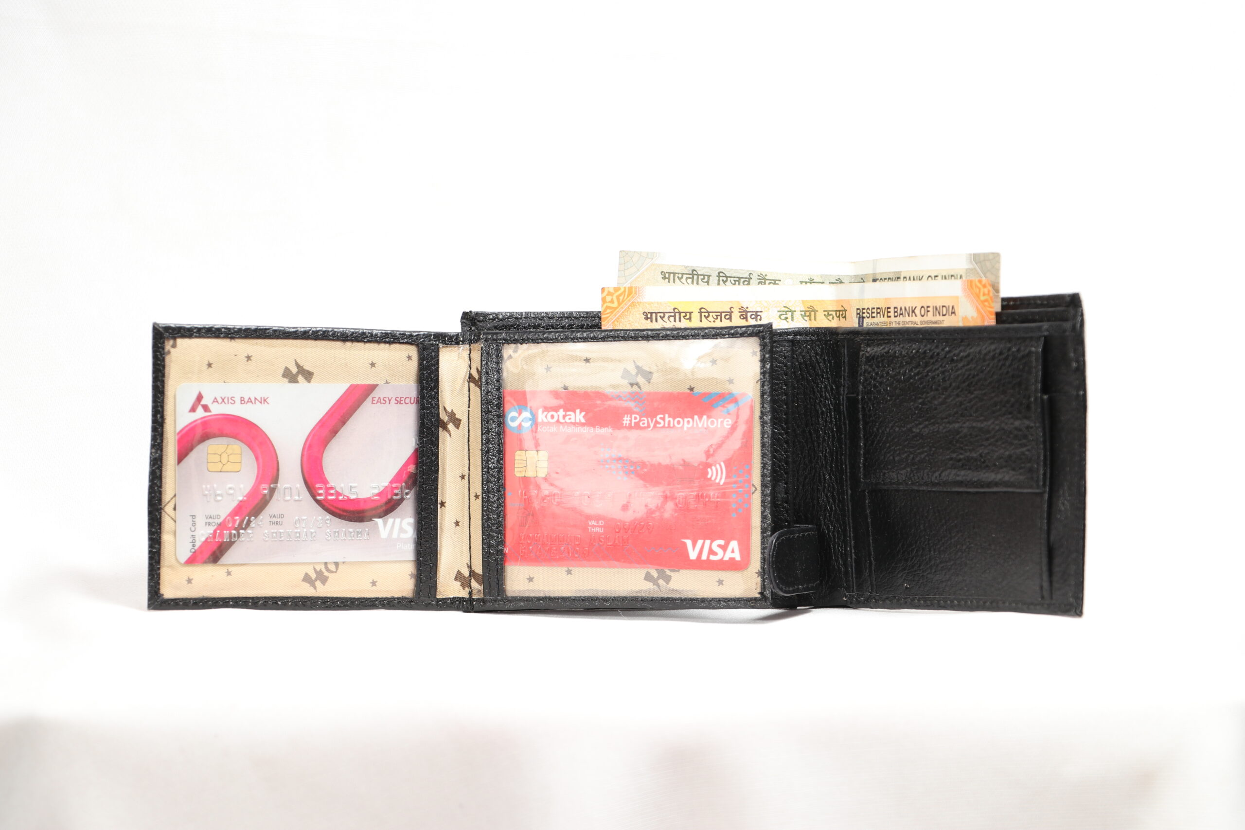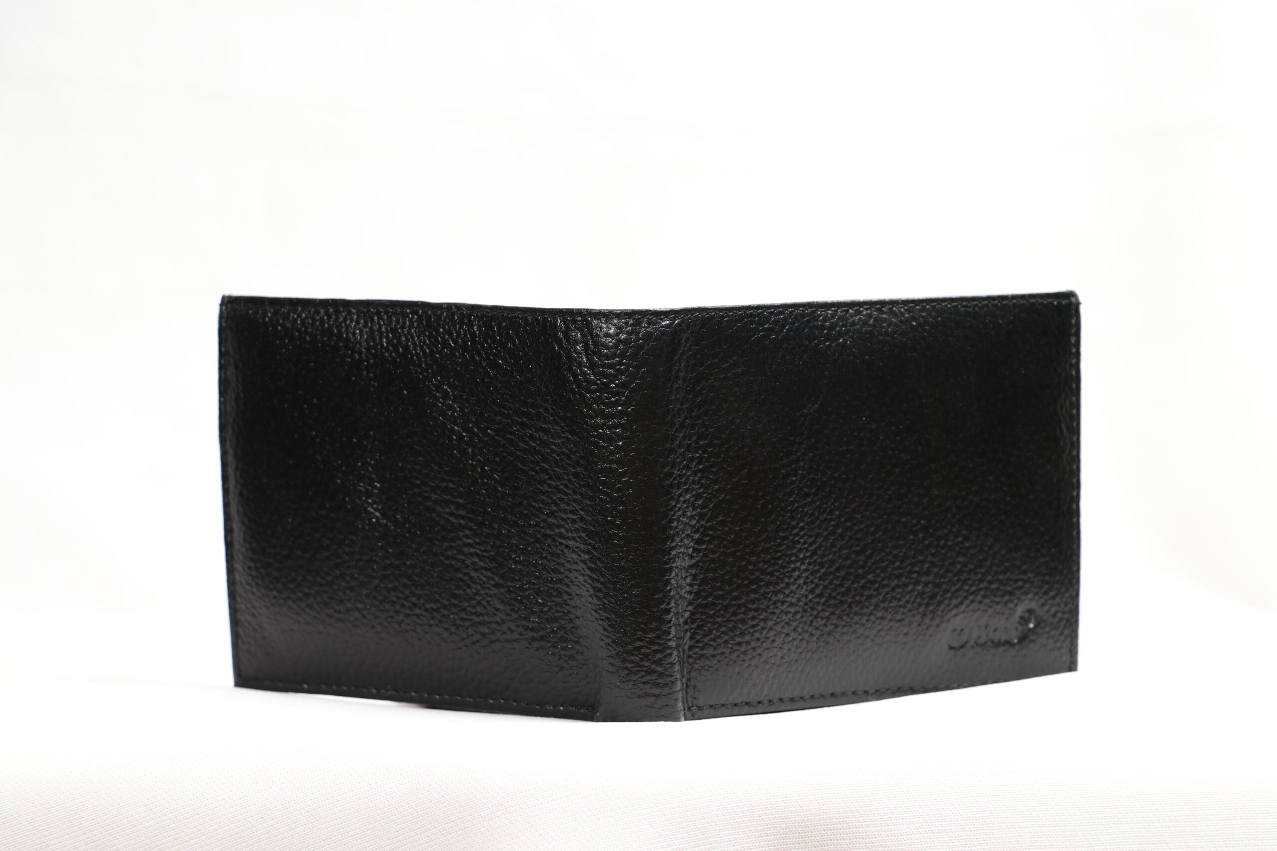 this sleek black bi-fold wallet features a textured leather finish that adds a touch of sophistication. Designed for everyday convenience, it offers a slim profile while providing ample space for cards and cash. Its classic look and durable construction make it a timeless essential for daily use.